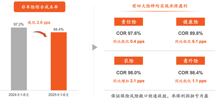 分险种来看,2025年上半年平安车险业务实现原保险保费收入1,086.11亿元,同比增长3.6%;综合成本率95.5%,同比优化2.6个百分点,主要得益于车险深化“报行合一”改革,持续推进费用精细化管理、优化费用投入。