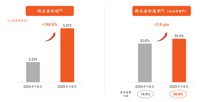 2025年上半年,银保渠道新业务价值59.72亿元,同比增长168.6%;按照标准保费计算的新业务价值率为34.4%,同比提升3.8个百分点,如果按照首年保费口径,则同比提升了9.7个百分点。