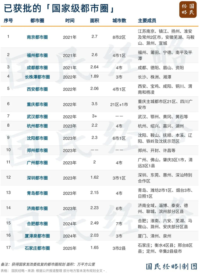 我国共有30多个大型都市圈,目前已批复17个国家级都市圈,涵盖广州、深圳、南京、杭州、成都、重庆、郑州、沈阳等重点城市。