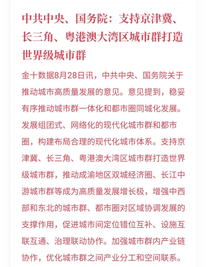 文件提出,稳妥有序推动城市群一体化和都市圈同城化发展。发展组团式、网络化的现代化城市群和都市圈,构建布局合理的现代化城市体系。