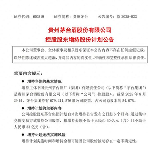 贵州茅台控股股东增持股份计划公告称,公司控股股东茅台集团计划自本次增持公告发布之日起6个月内,通过集中竞价交易方式增持公司股票,拟增持金额不低于30亿元(含)且不高于33亿元(含)。