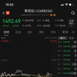 寒武纪28日总市值为6643.03亿元,29日总市值为6244亿元,单日蒸发近400亿元。