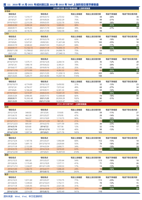 2)2018年10月-2021年成长股以及2012年-2015年TMT上涨阶段交易节奏复盘:以2018-2021年的半导体、CXO、光伏、电池各自在第四波上涨的时间空间来看,平均运行63个交易日、涨幅65%,后续调整平均用时27个交易日、回调幅度29%。2012-2015的TMT四大一级行业各自第四波上涨的时间空间来看,平均运行70个交易日、涨幅36%,后续调整平均用时40个交易日、回调幅度14%。