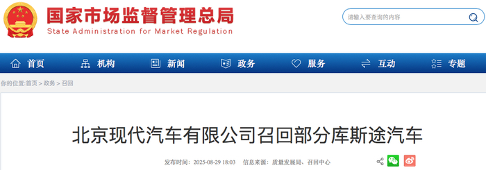 8月29日,国家市场监督管理总局发布召回公告,长城汽车股份有限公司、北京现代汽车有限公司、斯泰兰蒂斯(上海)汽车有限公司共三家车企根据《缺陷汽车产品召回管理条例》和《缺陷汽车产品召回管理条例实施办法》的要求,向国家市场监督管理总局备案了召回计划。