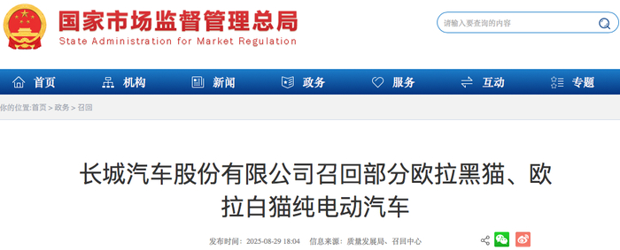 长城汽车股份有限公司召回编号S2025M0136V:自即日起,召回2021年7月2日至2022年4月30日期间生产的部分欧拉黑猫纯电动汽车,共计53辆;召回2021年7月19日至2021年12月27日期间生产的部分欧拉白猫纯电动汽车,共计14辆。召回原因是召回范围内的车辆,因动力电池生产过程问题,可能造成部分电芯正负极片偏移,引发电芯过度自放电。极端情况下,导致动力电池过热,存在安全隐患。针对以上缺陷,长城汽车股份有限公司将免费为召回范围内的车辆更换存在问题的动力电池模组,以消除安全隐患。