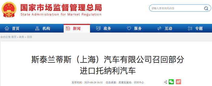 8月28日,斯泰兰蒂斯(上海)汽车有限公司还召回编号S2025M0135V:自2025年9月29日起,召回2023年5月25日至2023年10月9日期间生产的部分进口全新大切诺基4xe汽车,共计1861辆;召回编号S2025M0133V:自即日起,召回2023年10月6日至2024年5月13日期间生产的部分进口托纳利汽车,共计134辆。