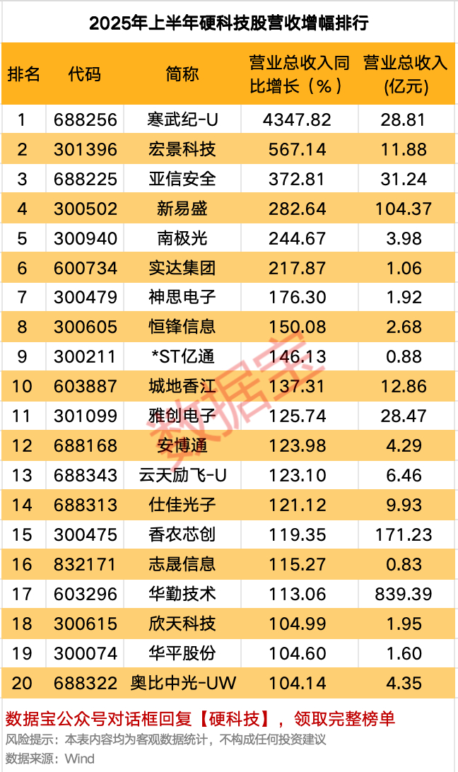 据数据宝统计,A股硬科技板块上半年营收逾100亿元的上市公司数量由2024年的41家增至2025年的49家,新加入的香农芯创、安克创新、生益科技、移远通信、科大讯飞、深南电路、新易盛和江波龙均是首次半年报营收破百亿元;京东方A营收则重回千亿元规模,为史上次高。