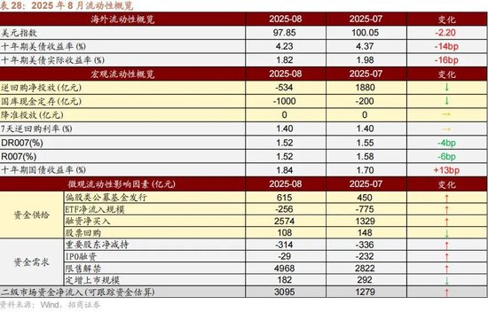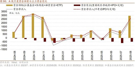 ⚑ 流动性与资金供需:9月增量资金或继续净流入,增量资金正反馈有望继续。宏观流动性方面,央行继续通过逆回购、MLF、买断式逆回购等中短期流动性管理工具满足流动性需求,主动呵护流动性的意愿较强,资金利率整体低位波动。展望9月考虑到央行货币政策基调偏呵护,资金面仍然有望保持平稳。外部流动性方面,鲍威尔在Jackson Hole央行年会上讲话内容整体相对偏鸽,叠加7月PCE符合预期,市场预期美联储9月大概率降息,美元指数有望维持弱势。8月股票市场可跟踪资金净流入规模扩大,融资资金成为主力增量资金。资金供给端,新发偏股基金规模回升,ETF净赎回规模收窄;市场风险偏好继续改善,融资资金净流入规模明显扩大。资金需求端,重要股东净减持规模小幅下降;IPO发行规模和再融资规模均有不同程度下降,资金需求规模缩小。展望2025年9月增量资金或继续净流入,增量资金正反馈有望继续,融资资金+私募基金+产业/主题ETF等资金有望继续活跃。