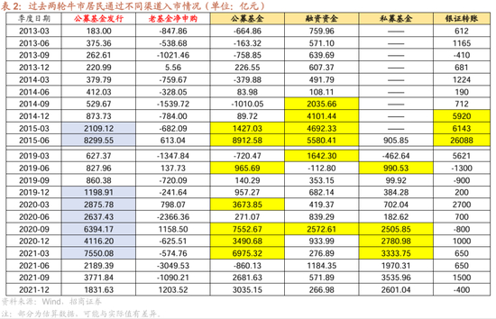 在2013-2015年的牛市中,居民资金入市路径呈现出“融资资金→银证转账→公募基金”的扩散过程。不过各渠道的参与程度和贡献度有所不同。具体来看,从2013年开始,除了2015Q2以外,融资资金基本一直都是居民资金入市的主要方式,贡献了持续的主要的增量资金。从2014Q4开始,居民直接开户买卖股票的规模显著扩大,尤其在2015Q2贡献了2.6万亿的增量。公募基金增量基本到了牛市后半段才开始加速,且主要来自于新发基金的扩张,老基金整体净赎回,仅在2015Q2短暂转为净申购。