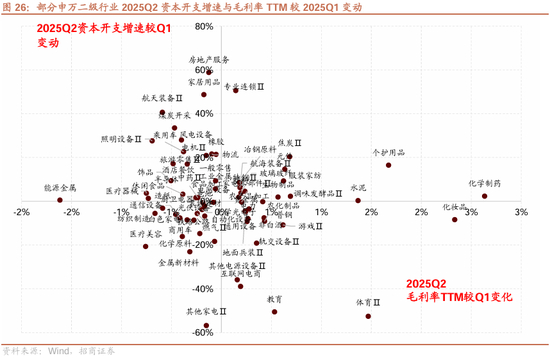 结合需求表现来看,化学制药、生物制品、水泥、焦炭、塑料、玻璃玻纤、调味发酵品、服装家纺等行业毛利TTM环比回暖,资本开支增速于底部改善,有望率先迎来产能出清;化妆品、普钢、非白酒、轨交设备、农产品加工、通用设备、地面兵装、其他电源设备等行业需求回暖,2025Q2毛利TTM较2025Q1回升,且资本开支增速下行,供需结构有望加速改善。
