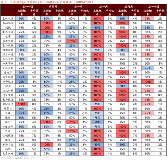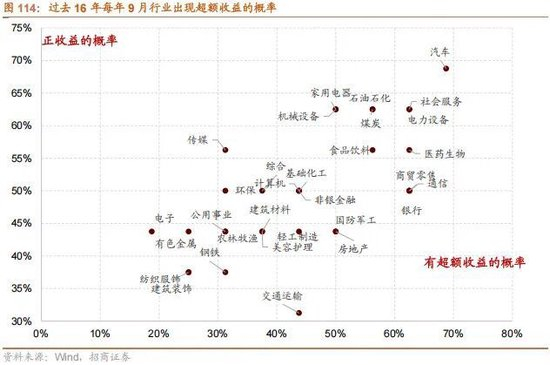 由于每年例如业绩预告、两会、政治局会议、业绩考核等等具有季节性效应,每个月的行业有一定的季节性,也可以作为行业选择的参考。每年9月,相对较高概率出现超额收益的行业主要集中在汽车、社会服务、医药生物、电力设备、商贸零售、通信、食品饮料等。