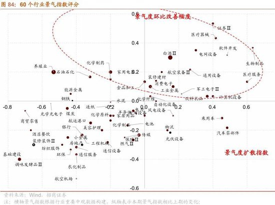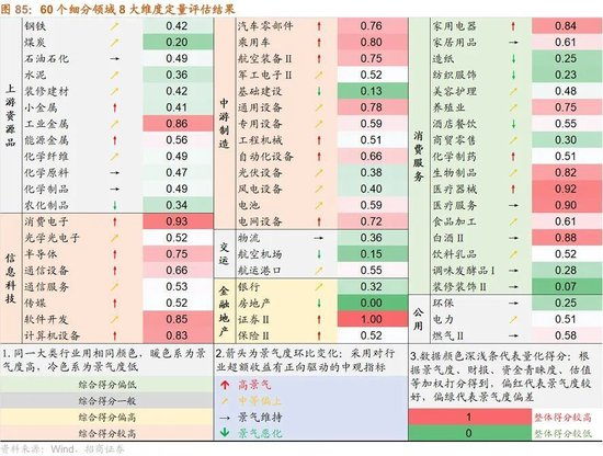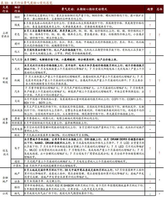 8月份景气较高的领域主要集中在部分资源品、中游制造和信息技术领域,其中资源品板块水泥、贵金属价格上涨,中游制造领域新能源和光伏产业链价格回暖,消费服务板块票房收入上行,金融地产中A股换手率上行,公用事业领域发电量同比增幅扩大。