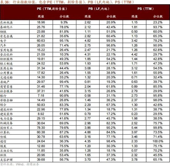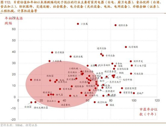 前期表现:目前处于低位的领域:涨跌幅:年初以来小金属、通信设备、化学制药、通用设备、能源金属、医疗服务、工业金属等涨幅居前;白酒、酒店餐饮、煤炭、航空机场、饮料乳品石油石化等涨幅靠后。市盈率分位数:截至目前,软件开发、军工电子、风电设备、房地产、化学制药等估值处于近十年的中高水平。