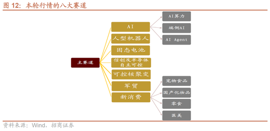 当然,市场的上行过程中不可避免出现调整,从历史上牛市第二阶段调整的历史经验来看,这种调整通常时间会比较短,出现2-3个交易日调整或者单日调整幅度超过5%是较为常见的形态,调整结束后会继续创新高。牛市第二阶段增量资金正反馈的终结往往是监管态度变化阻止了正反馈机制的形成,目前来看,并未看到类似的严监管的信号。牛市第二阶段的核心特征是增量资金抱团大空间低渗透率的赛道,因此调整后资金回归赛道是大概率事件。应对策略上有三种策略,第一是产业链跟踪策略,调整出现后第一时间找到产业链有渗透率加速提升变化的赛道,可能是原来强势赛道有新变化也可能是新赛道;第二是产业链核心标的首板策略。在调整结束反弹时,当某一个产业链核心标的出现第一个涨停板,可能就是市场作出的方向选择。第三是产业链龙头布局。而牛市第二阶段的核心特征是增量资金抱团大空间低渗透率的赛道,目前来看以人工智能为代表的8个核心赛道(AI/人形机器人/固态电池/可控核聚变/半导体自主可控/创新药/新消费/军工(军贸、商业航天和卫星互联网))的核心龙头标的进行分散布局,持股待涨也不失为是一个较好的策略。