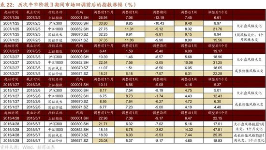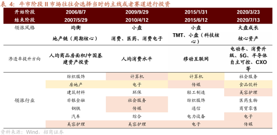 第二阶段结束的标志,往往是政策的转变,可能是针对资本市场快速上涨的降温措施,也可能是宽松政策的边际收敛,例如2007年530提高股票交易印花税,2015年5月对于融资融券规范监管和对于场外配资的规范;2010年4月对房地产政策的收紧,货币政策方面央票的重启发行;2020年7月也出现了货币政策边际收敛,对场外配资等也加大了监管力度。