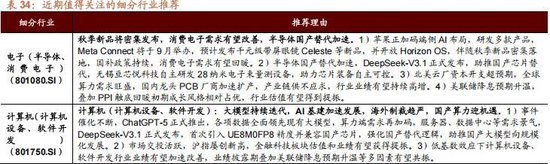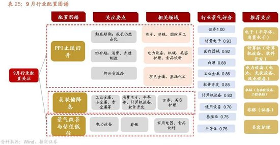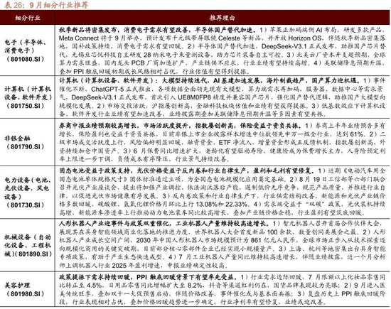 综合盈利、行业景气和交易等维度,9月份我们建议关注重点关注中报业绩预期延续增长或者边际改善、景气度相对较高、政策持续催化的领域,具体涉及电子(半导体、消费电子)、计算机(计算机设备、软件开发)、非银、电力设备(电池、光伏设备、风电设备)、机械设备(自动化设备、工程机械)、美容护理等细分领域。