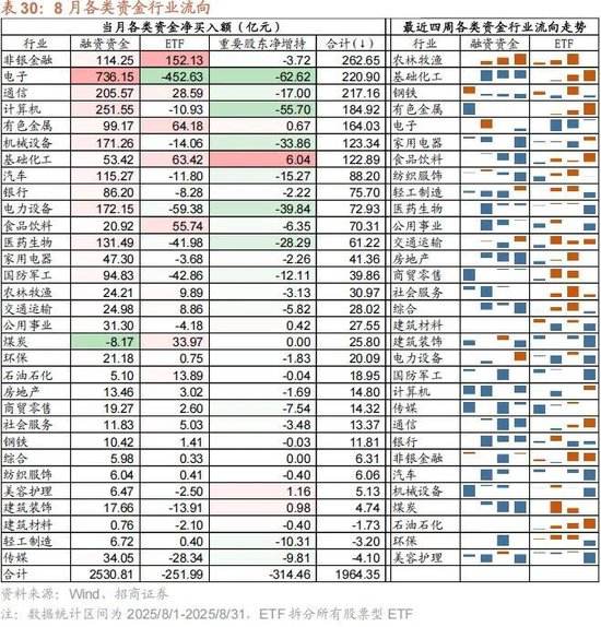 ⚑ 风格与行业配置思路:风格选择方面,9月市场风格可能相对偏大盘,成长风格有望继续占优。9月推荐的风格指数组合包括创业板50、沪深300、300现金流、恒生科技。行业选择层面,考虑未来一两个月的角度,综合考虑前期表现、估值、交易活跃度、景气变化、政策和事件催化,我们建议重点关注受益于PPI触底、美联储降息的领域,以及业绩增速较高或有拐点的领域,具体涉及电子(半导体、消费电子)、计算机(计算机设备、软件开发)、非银、电力设备(电池、光伏设备、风电设备)、机械设备(自动化设备、工程机械)、美容护理等细分领域等行业。