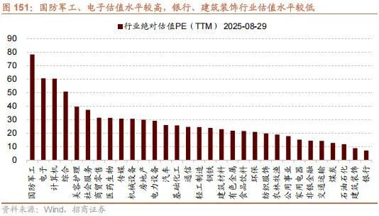 分行业来看,国防军工、电子、计算机、美容护理、社会服务的估值水平高于其他行业,银行、建筑装饰、石油石化、煤炭、交通运输估值水平较低,其中银行的估值水平处于末位。