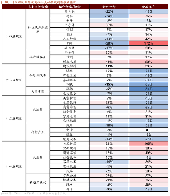 关于十五五规划,复盘前四次五年规划市场表现发现,会议前大盘风格相对占优,会议后小盘风格显著走强。从行业表现来看,五中全会前一个月国防军工题材相对占优,会议后一至两周为行情集中爆发期,多个行业上涨。从十一五到十四五,政策重点支持的板块均跑出了不错的超额收益。结合二十届三中全会以及此前五年规划政策脉络的变化情况,建议重点关注三个方面:外部形势变化、扩大内需,以及科技创新。