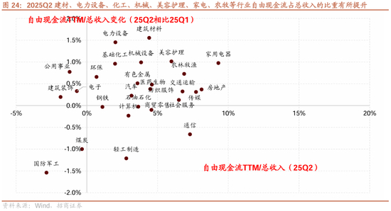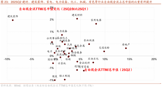 一级行业中,与2025年一季度相比,建材、建筑装饰、家电、电力设备、化工、机械、有色、汽车、农牧等行业自由现金流占总市值与总收入的比重均有明显改善。