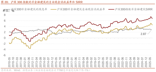从沪深300非金融建筑的自由现金流收益率和内在回报率的角度来看,目前在市场大涨后,沪深300非金融建筑自由现金流收益率仍然有4.5%,考虑永续增速后的内在回报率SIRR还有6.7%。