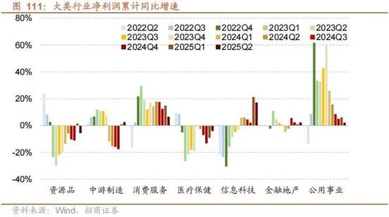 大类行业25Q2单季度增速:信息科技>中游制造>金融地产>医疗保健>公用事业>消费服务>资源品:上游资源品行业单季盈利增速转负;中游制造业单季利润增幅扩大,电力设备、国防军工等改善较为明显。消费服务单季度利润增速转负,除美容护理外,多数板块盈利放缓;医药板块单季度盈利增速转正;TMT盈利增速领先,电子、传媒增速较高;公用事业单季度盈利增速转负。金融地产单季度利润增幅扩大,银行增速转正,地产跌幅收窄。