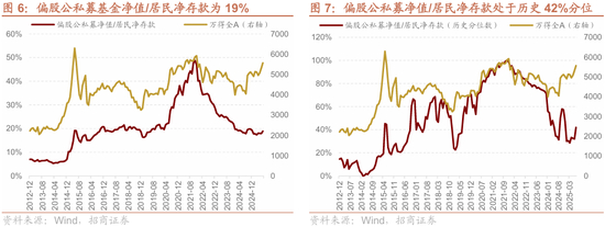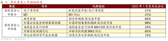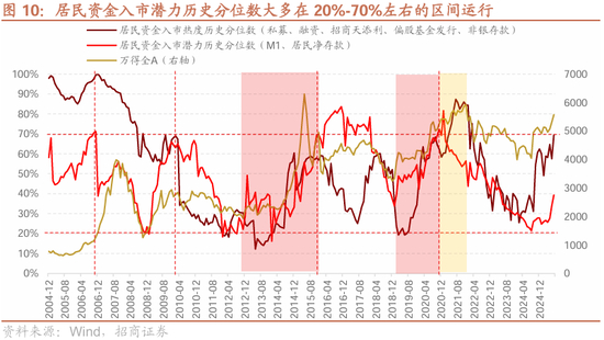 从历史表现上看,居民资金入市潜力历史分位数指标大多在20%-70%左右的区间运行,20%是相对低值,处于20%附近说明居民资金入市潜力较大,此时市场也多处于相对底部。70%附近则意味着居民资金入市潜力基本消耗殆尽,后续新增场外资金相对有限。相对于市场表现看,无论是底部还是顶部,入市潜力指标都相对领先或同步于万得全A指数表现。截至2025年7月末,居民资金入市潜力分位数处在39%,若未来权益市场进一步上行,居民资金入市趋势加速,假设提升至70%-100%上限意味着还有31%-61%的潜在分位数上行空间。