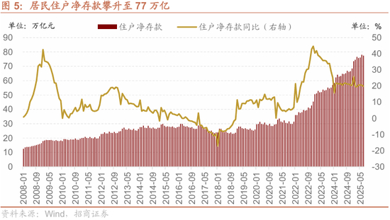 历史上A股每一轮大级别牛市都离不开居民资金的贡献。自2022年以来,居民可投资资金大幅增长,截至2025年7月居民净存款升至77.4万亿,居民待投资金规模极为庞大。
