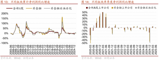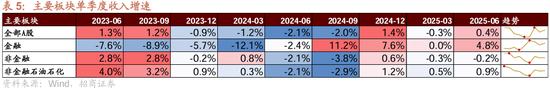 全部A股/非金融/非金融石油石化单季度收入增速较一季度均有改善。全A板块2024Q4/2025Q1/2025Q2单季度收入增速依次为1.4%/-0.3%/0.4%,非金融石油石化板块2024Q4/2025Q1/2025Q2单季度收入增速依次为1.2%/0.5%/0.9%。