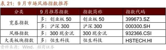 风格选择方面,9月市场风格可能相对偏大盘,成长风格有望继续占优。9月推荐的风格指数组合包括创业板50、沪深300、300现金流、恒生科技。行业选择层面,考虑未来一两个月的角度,综合考虑前期表现、估值、交易活跃度、景气变化、政策和事件催化,我们建议重点关注受益于PPI触底、美联储降息的领域,以及业绩增速较高或有拐点的领域,具体涉及电子(半导体、消费电子)、计算机(计算机设备、软件开发)、非银、电力设备(电池、光伏设备、风电设备)、机械设备(自动化设备、工程机械)、美容护理等细分领域等行业。