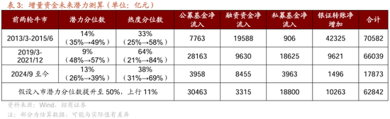 结合过去两轮牛市居民资金入市的主要渠道及其净流入规模看,2013/3-2015/6期间融资和银证转账是居民资金入市的主要渠道,入市潜力分位数由35%提升到49%,估算对应的四大渠道流入股票市场增量资金7万亿。2019/3-2021/12这轮牛市期间,居民资金入市潜力分位数提升了9%,对应的增量资金近6.6万亿。以2019-2021这一轮牛市为参考,居民资金入市潜力分位数每提升一个百分点对应的公募、融资、私募、银证转账净流入为3129亿元、1070亿元、2069亿元、1069亿元。以2024年9月作为本轮牛市的起点,假设入市潜力分位数提升到50%,即在当前39%的位置上继续上行11%,估算四大主要渠道累计有望净流入8.07万亿,剔除掉截至目前已经净流入的1.8万亿后,预计后续增量资金仍有6.3万亿左右。