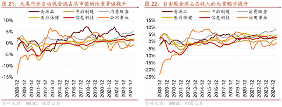 大类行业来看,自由现金流(TTM)占总收入比重:消费服务>医疗保健>信息技术、资源品>中游制造业,其中医疗保健、资源品和中游制造业行业自由现金流占收入的比重均有所提升