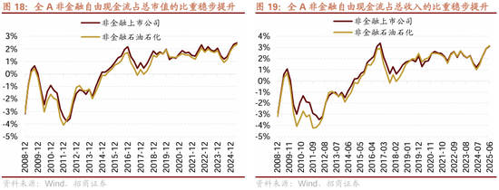 2014年以来A股整体自由现金流占总市值的比重稳步提升,2025Q2全A非金融自由现金流占总市值(TTM)的比重为2.5%,相比2025Q1提升0.1个百分点;2025Q2全A非金融自由现金流占总收入的比重为3.1%,相比2025Q1提升0.2个百分点。