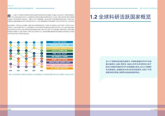 2020-2024年,全球CGT领域发文量达21万篇以上,复合年均增长率为3.9%,高于医学领域平均水平。中国和美国在科研产出上领先,分别贡献了6万余篇和5.8万余篇研究成果。中国在发文量上增长迅速,但学术影响力(FWCI为1.27)与领先国家相比仍有差距。