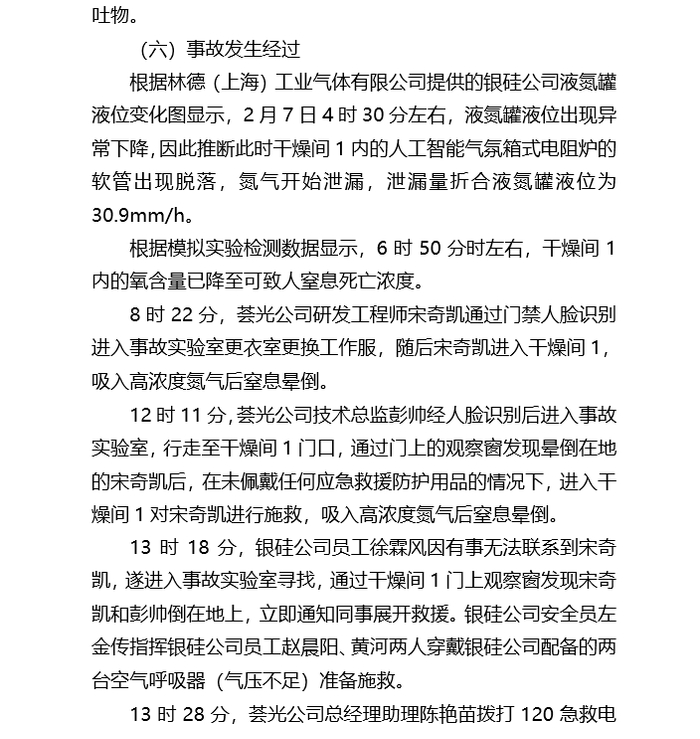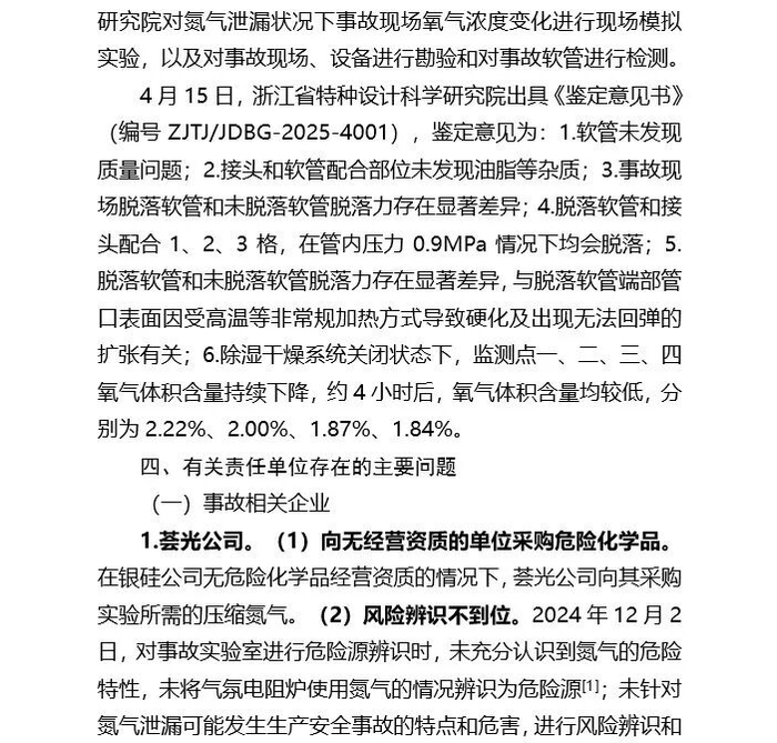 事故调查组通过现场勘查、视频分析、人员询问等,排除了人为故意等引发氮气泄漏的因素。