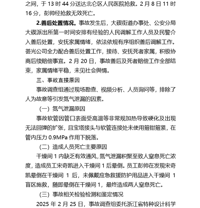 干燥间1内缺乏有效通风,氮气泄漏积聚至致人窒息死亡浓度,造成员工宋奇凯进入干燥间1后晕倒。员工彭帅在发现宋奇凯晕倒在干燥间1后,未佩戴应急救援防护用品进入干燥间1盲区施救,随即晕倒在干燥间1,最终造成两人窒息死亡。