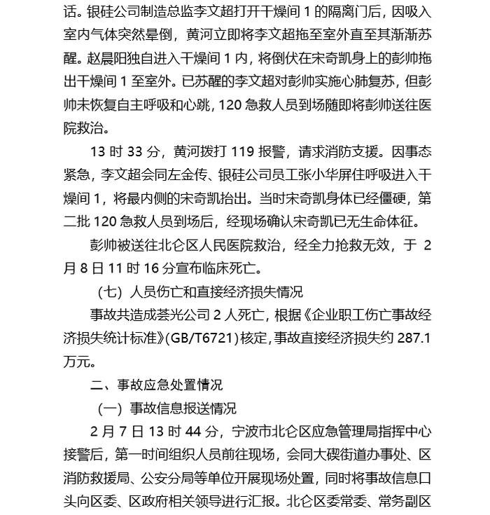 2025年2月7日8时30分许,位于北仑区大碶街道龙角山路188号的荟光(宁波)科技有限公司发生一起中毒和窒息事故,造成2人死亡,直接经济损失约287.1万元。