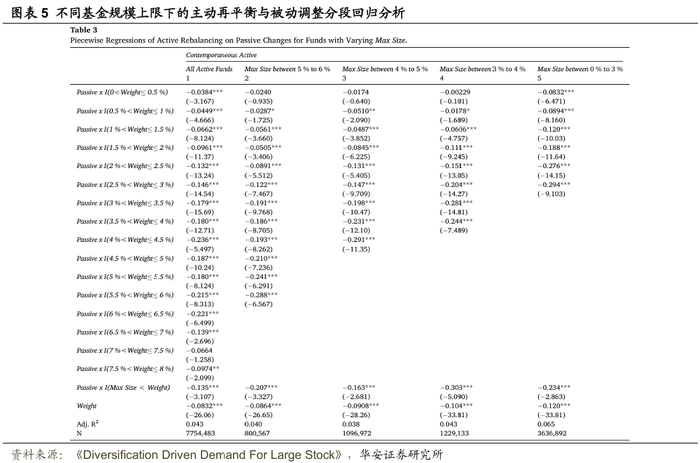 附录A2对市值加权指数基金进行了再平衡系数的安慰剂测试。这些指数基金在投资组合管理中没有自主决策权,也不遵循需要特定机械性逆向交易的策略。这些基金背后的投资原则是复制其各自基准的表现,要么按比例持有其成分股,要么实施最小化跟踪误差的策略。附录表A2对这些市值加权实体进行了与图表3相同的回归。在其中,发现Passive和Active成分之间没有显著的负相关关系(无论是同期还是跨季度)。甚至Passive+与下一季度的Active之间存在轻微的正相关关系,可能反映了(指数成分股)发行的模式。这些安慰剂结果表明,发现既不是由噪音驱动,也不是由机械性再平衡驱动。