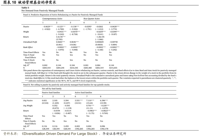 相反,从面板B的第(4)到(6)列来看,主动型基金家族倾向于与平均Passive相反的方向交易大市值股票,表明它们的再平衡交易对股票市场产生了净需求。接下来的部分将重点讨论其定价后果。