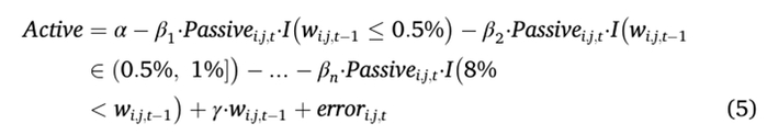 此处,w 是股票 i 在季度 t 的预测权重,由使用上一季度观测权重的回报率计算得出。r 是股票的季度回报率。如果基金 j 未进行交易,只是简单地持有其上一季度的投资组合至本季度末,那么 w 将是该股票的最终权重。因此,Passive(w与初始权重之间的差值)是在假设本季度内没有交易的情况下,由市场回报驱动的头寸集中度变化。