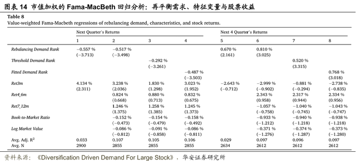 这种负回报及之后的反转模式与过去的回报相一致。过去季度回报低的大盘股倾向于在每个季度末的交易日内表现不佳,而过去回报高的股票倾向于在临近季末时表现良好,这反转了前一节讨论的短期可预测性。第IV.C节描述了大盘股动量投资组合的季度内模式,该模式显示出类似的形态,并反映了回报对投资组合集中度的混淆效应。虽然这些设定表明了短期的可预测性,但与传统的基于过去回报的可预测性(如动量和短期反转效应)存在混淆效应。第二组主要设定除了再平衡需求外,还明确控制了不同期限的过去回报。这些设定试图控制过去业绩对再平衡的混淆效应,并通过1)明确控制动量和短期反转因子,以及2)排除过去季度回报极端为负的股票来过滤日历时间结果——现有文献Stambaughetal.(2012)证明,动量回报与其空头端高度相关。此测试的目的是假设经典动量所依据的经济力量与再平衡需求渠道不同。如果情况如此(正如股票基金对小权重和大权重头寸的回报交易敏感性差异所似乎表明的那样),那么明确控制过去回报及其重要空头端的日历时间策略应该可能对回报有更清晰的预测。图表14报告了控制不同期限历史回报的未来回报的Fama-Macbeth回归。在该表中,将个股的超额回报对其再平衡需求的百分位排名、过去3个月、6个月和12个月的回报、账面市值比和对数市值进行回归。同样,每个季度的截面回归按每只股票的市值加权。在控制了短期回报后,再平衡需求负面预测未来的股票超额回报。如列1所示,在控制了不同期限的过去回报后,回归表明再平衡需求百分位排名增加一个标准差,预测下一季度的回报为-0.56%(t=-3.71)。阈值需求和拟合需求在列(3)和(4)中给出了广泛可比的直接季度回报可预测性。这种价格效应是暂时的。此外,观察到这种价格效应的长期反转。在列(5)至(8)中,观察到这些异常回报在接下来的四个季度中几乎完全消失。同样的暂时性价格下跌遇到了正回报。再平衡需求增加一个标准差,在此范围内会伴随0.67%(t=2.16)的回报,这包含了先前由卖出驱动的价格可预测性;而阈值需求和拟合需求分别预测在一年内类似水平的反转,为0.52%和0.77%。分散化驱动需求度量的一个有趣特性是,在多元回归中加入这些特征会增强近期动量特征与未来回报之间的正相关性。在所有回归设定中,过去三个月回报对未来超额回报的系数在与再平衡需求的双变量回归中显示出正的可预测性。这两个变量往往相关但捕捉不同机制的事实,或许可以解释一个确有根据的现象:美国股票的动量回报主要不是由近期过去的表现驱动——短期回报往往与股票型共同基金的逐季再平衡相混淆。第III.C节将进一步探讨动量与分散化驱动需求之间的关系。