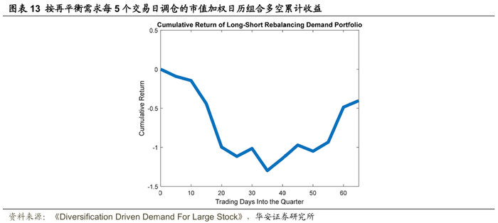 图表13绘制了在整个季度内,通过做多按再平衡需求排序的最高五分位投资组合并做空最低五分位投资组合而构建的多空投资组合的累积回报。作者看到存在清晰的异常回报和反转的V型模式。在样本期内,累积回报在每个季度的第35个交易日触底。这些峰值和反转表明了价格压力和非基本面需求。此外,这些模式并非由每年中的任何特定季度驱动,并且排除任何特定季节后仍然稳健。这种模式不同于传统的股票一月效应。