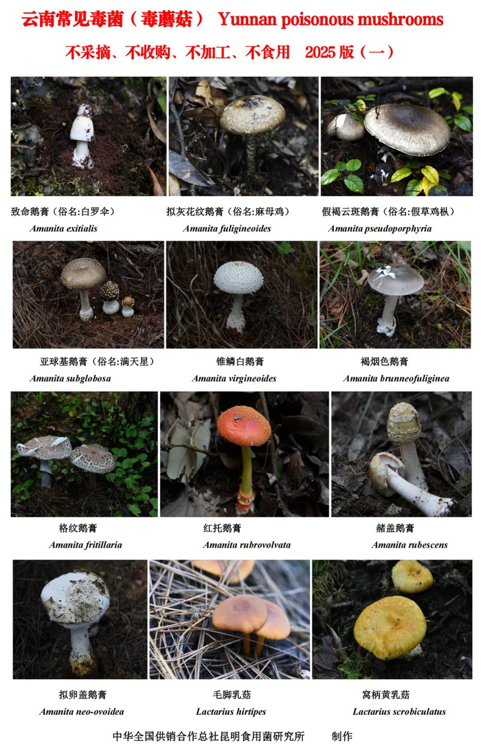 《云南常见毒菌(毒蘑菇)不采摘、不收购、不加工、不食用2025版》(一)(二)图鉴由中华全国供销合作总社昆明食用菌研究所制作。新版图鉴基于近年来云南省毒蘑菇中毒案例监测数据、物种分类学研究进展及野外实地调研成果,进行了系统更新。2025版在以往版本的基础上,新增了红托鹅膏、锥鳞白鹅膏、亚球基鹅膏等在云南较为常见且有中毒案例报道的毒菌物种,并更新了多种常见毒菌的高清影像资料,力求内容科学准确、通俗易懂。