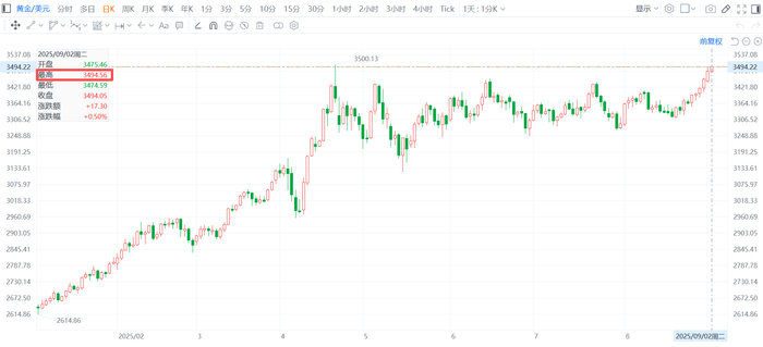 现货黄金站上3490美元
