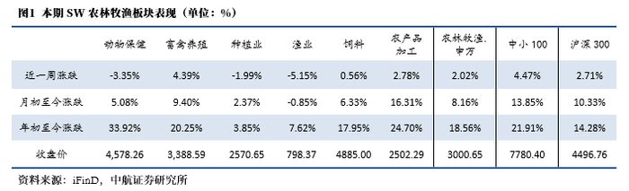 本期(2025.08.23-2025.08.29)上证综指收于3857.93,本期涨0.84%;沪深300指数收于4496.76,本期涨2.71%;本期申万农林牧渔行业指数收于3000.65,本期跌2.02%,在申万31个一级行业板块中涨跌幅排名8位,二级板块动物保健、畜禽养殖、种植业、渔业、饲料、农产品加工的周涨跌幅分别为-3.35%、4.39%、-1.99%、-5.15%、0.56%、2.78%。
