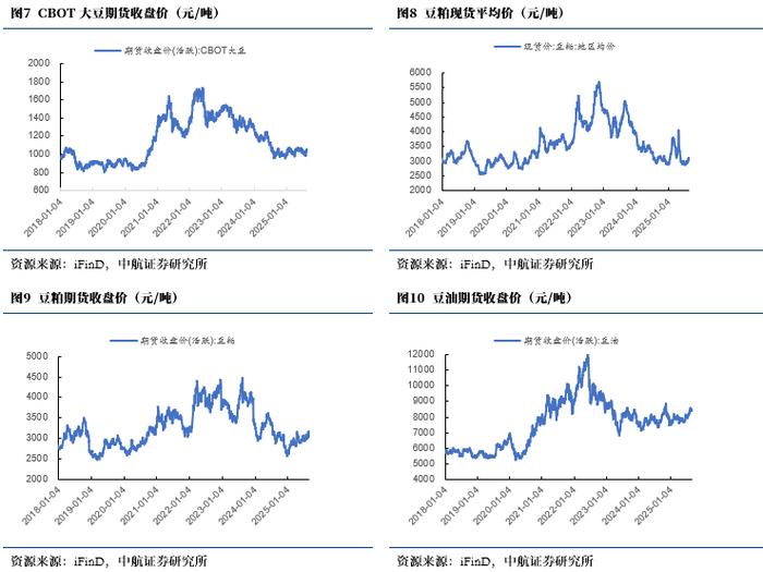 大豆:大豆现货平均价周环比涨1.34%,CBOT大豆期货价格周环比跌0.19%。