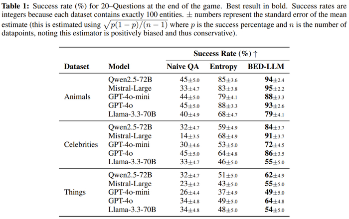 结果显示,无论是在「20 个问题」猜谜游戏还是电影偏好推荐任务中,BED-LLM 的表现都全面超越了基准方法 。
