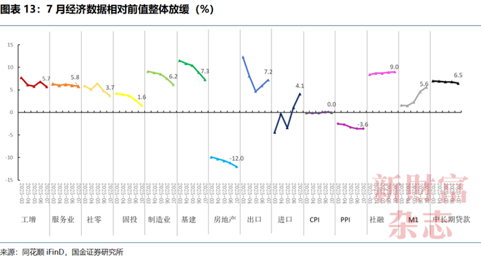 7月投资端全面走弱。固定资产投资累计增速下滑1.6个百分点,7月单月投资增速更是直接转为-5.2%。其中,制造业投资单月增速从5.1%降至-0.3%,可能受到“反内卷”政策下企业投资更趋谨慎的影响。基建投资在狭义和广义口径下均已转负,部分受到“南旱北涝”等极端天气因素的扰动。