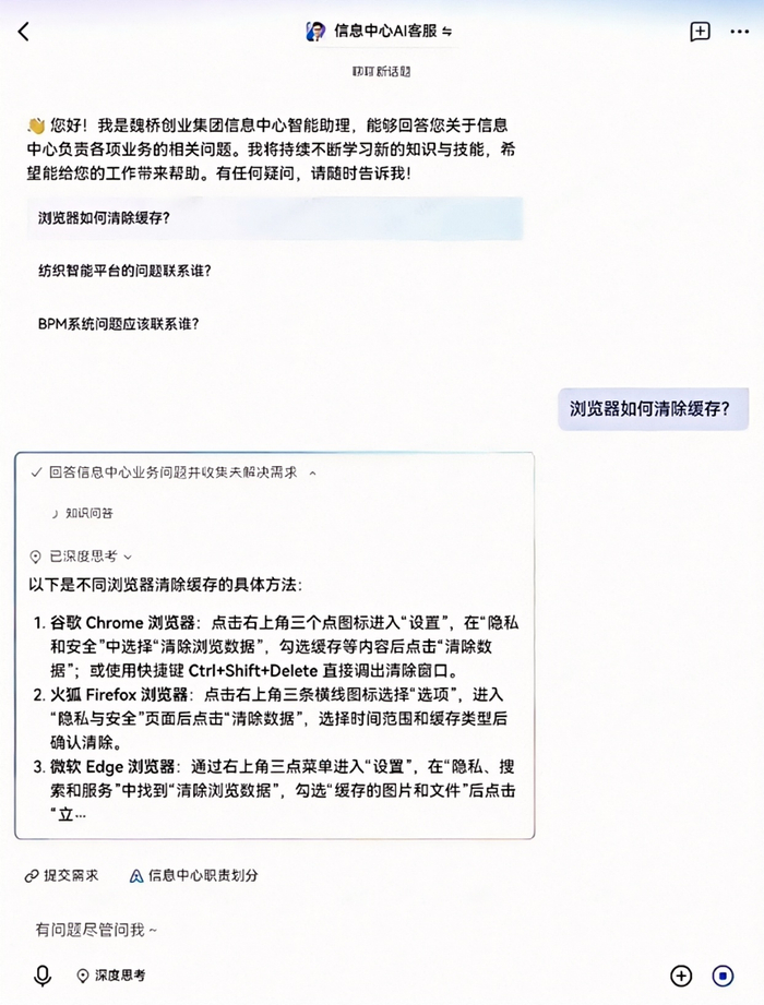 几个月前,信息中心的团队每天都苦恼于几十个电话、上百封邮件,为同事解答“浏览器怎么清缓存”之类的琐碎问题。当“信息中心 AI 助理”上线后,三分之二的需求都能被AI助理正确回答,剩下的问题也能自动流转、派工、跟进,让一个十万人的大型传统制造业集团的IT支撑变得格外顺畅高效。
