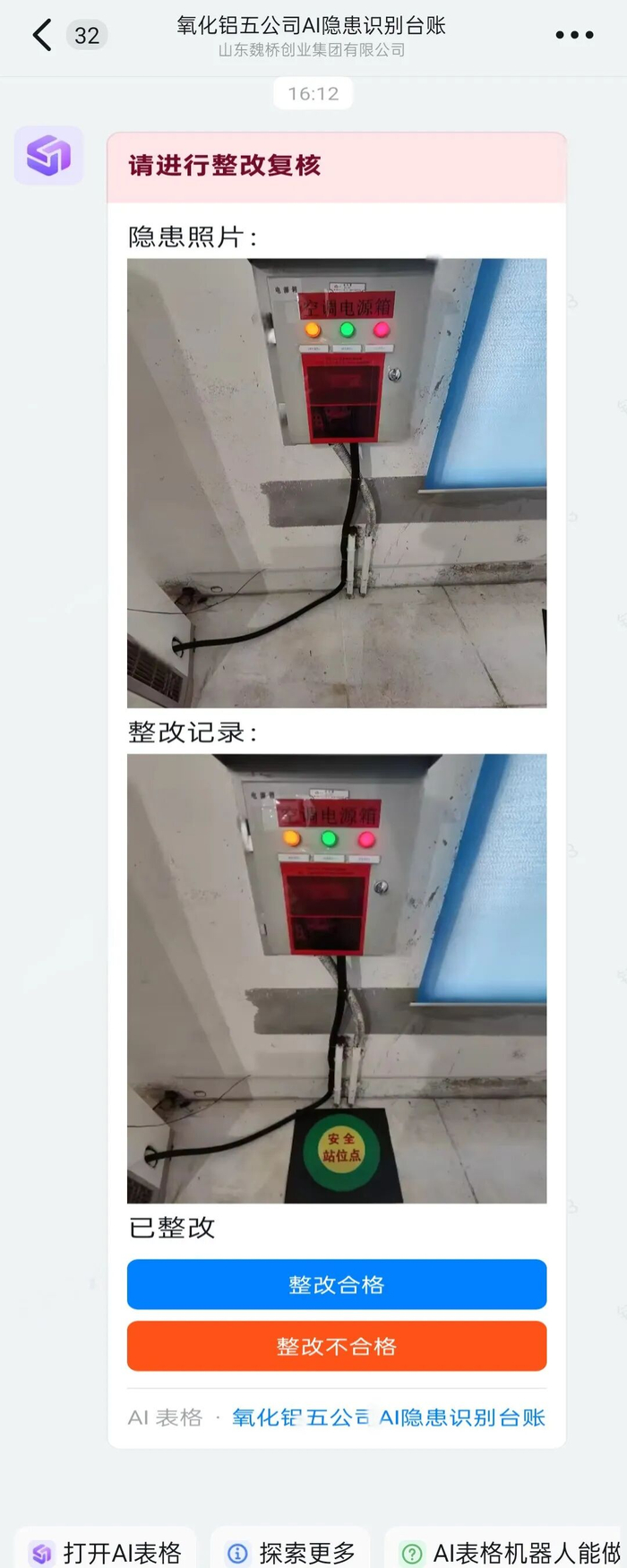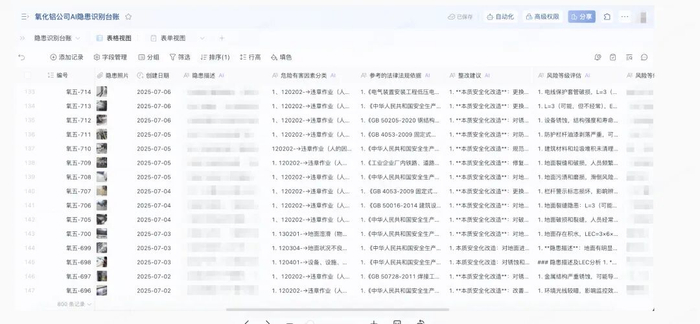 比如氧化铝分公司的马师傅,用 AI 表格做了“隐患识别台账”,巡检员只要拍张照上传,AI 就能指出风险点,甚至给出整改建议,至今已揪出 800 多处安全隐患。